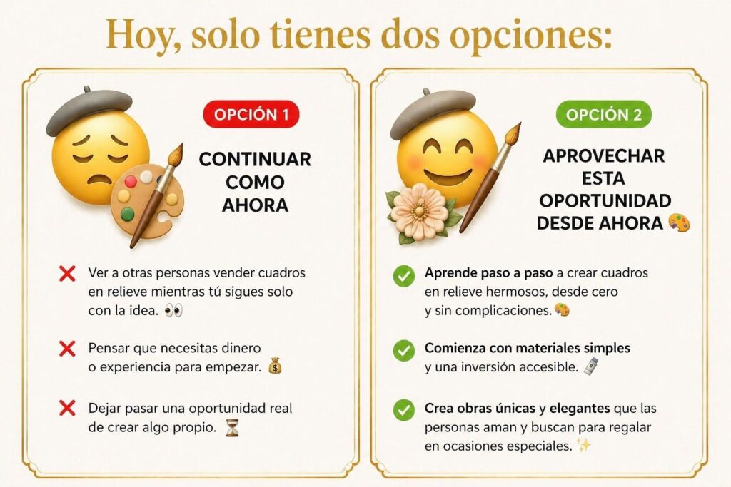 Clara Méndez, artista visual y especialista en técnicas de relieve y texturas, ha dedicado su carrera a enseñar cómo transformar materiales simples en obras con profundidad, volumen y elegancia. Su guía nace del deseo de inspirar a mujeres creativas que buscan expresar su esencia a través del arte, encontrar bienestar emocional y descubrir una fuente de ingresos desde casa. Con un enfoque práctico y motivador, Clara combina experiencia, técnica y pasión para que cada alumna pueda crear piezas únicas, relajarse y desarrollar su propio estilo artístico desde la primera semana.